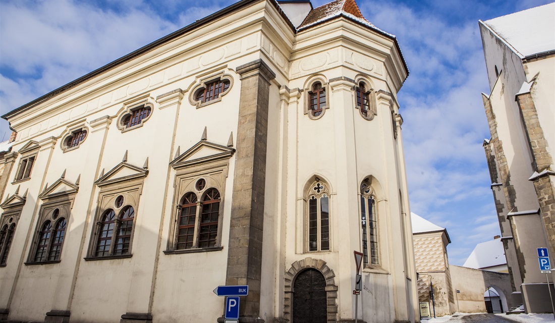 Kostel byl založený Jindřichem I., který udělil patronátní právo k jeho postavení řádu Německých rytířů. Od Jindřichova syna Vítka bylo toto právo potvrzené v r. 1255. Protože kostel nebyl velký, býval často nazýván kaplí. Řád zde zároveň vystavěl špitál pro 12 osob. Roku 1594 byl kostel připojen k jezuitské koleji, která zde byla místo špitálu a sousedních budov vystavěna. Když roku 1615 shořel, nechal v letech 1628-1632 Vilém Slavata vystavět nový kostel za 12 tisíc rýnských zlatých ze zabaveného majetku odbojných měšťanů. V roce 1652 byla přistavěna ke kostelu věž, která byla údajně tak velká jako farní.